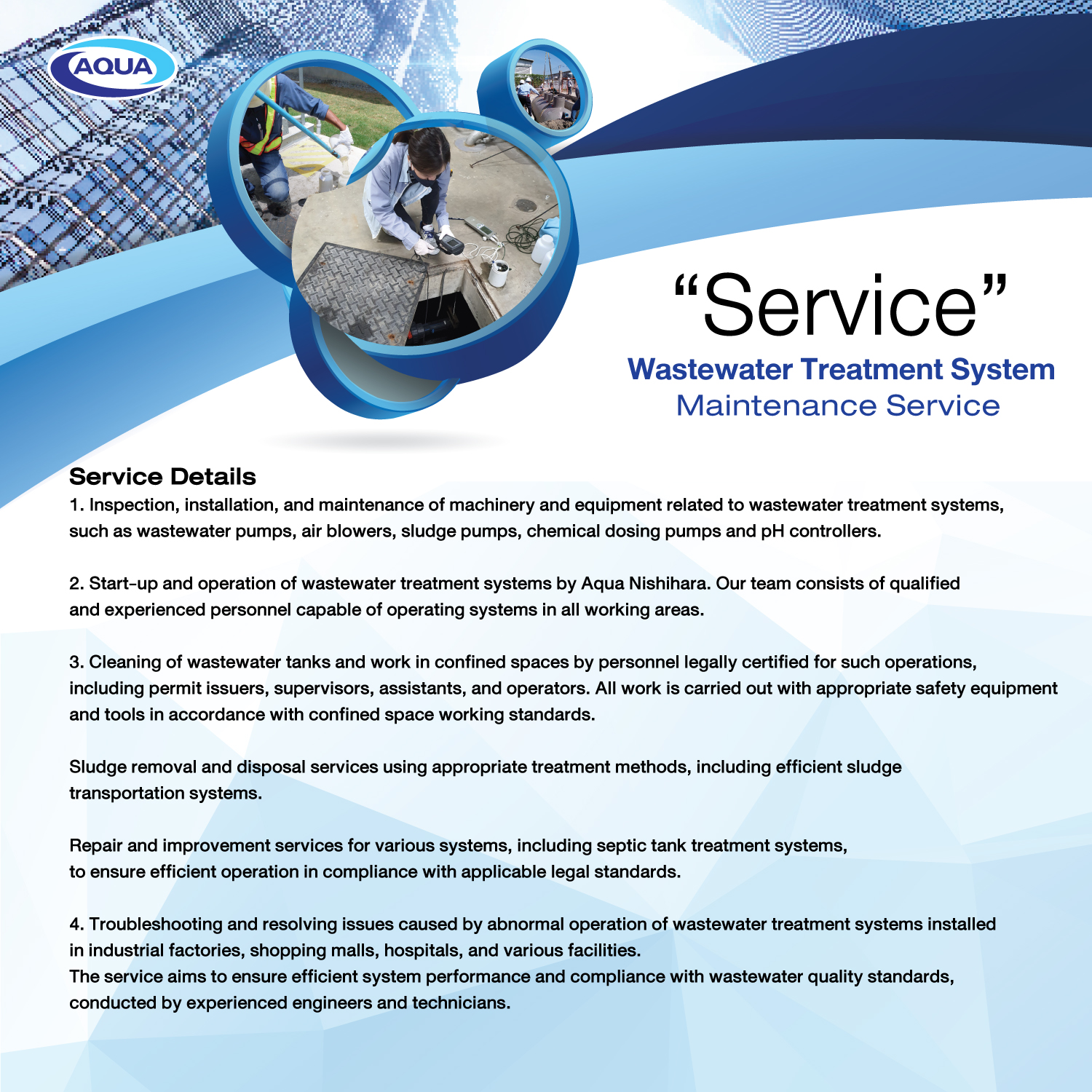 Aqua Nishihara has been managing water treatment systems for over 30 years. We have developed various services To cover the needs of customers and to ensure the management of water and wastewater quality Go as efficiently as possible