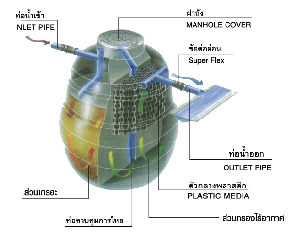 1.ช่องผ่านน้ำเสียที่ผ่านจากการแยกกากจากส่วนแยกตะกอนอยู่สูงจากก้นถังและทำให้น้ำเสียใสเท่านั้นที่เข้าสู่ส่วนกรองโดยไม่มีตะกอนหนักหรือตะกอนเบาปะปนเข้าไปส่วนกรอง