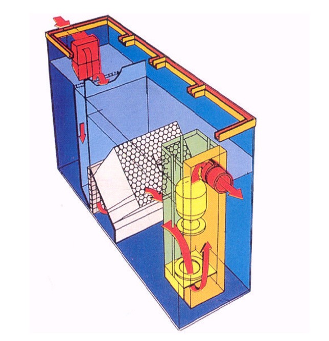 The direct and indirect discharge of oily wastewater into the natural waterways has a disastrous impact on the environment. The solution is to trap the oil pollution at source with proper devices . The Saint Dizier oil interceptors incorporate a sludge trap and can also be designed to include a flow rate controller upstream of the device to ensure no accidental discharge of oil during periods of excessive wastewater flow. The appliance combines the functions of a sludge trap and oil interceptor. It is equipped with a lamellar honeycomb cell which promotes coalescence of hydrocarbons with its large active surface. The appliance contains a deflector, a detachable bar screen, a detachable lamellar honeycomb cell and a stainless steel automatic blocking device.